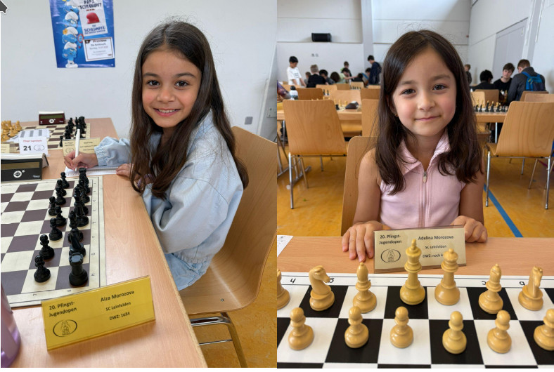 Beim Pfingst-Jugendopen 2025 in Gernsheim spielten zwei unserer Jugendlichen mit: Aiza Morozova (im Bild links) holte mit 3 Punkten aus 7 Partien einen guten Platz im Mittelfeld, sie wurde elfte von 20 Teilnehmern in der Altersgruppe U12. Adelina Morozova (im Bild rechts) erzielte 2 Punkte aus 7 Partien und wurde damit vierte von 8 Teilnehmern in der Altersgruppe U8. Herzlichen Glückwunsch!
